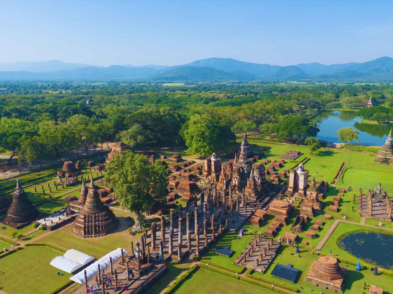 Veniamo al cuore storico della Thailandia, dove passeggiare tra stupa, laterizie e statue millenarie permette di percepire la continuità silenziosa di un impero che ancora oggi respira tra le sue rovine. Siete ad Ayutthaya, antica capitale del Regno del Siam e oggi Patrimonio UNESCO. Nell’omonimo parco si ammirano Wat Mahathat, con la testa del Buddha tra le radici di un albero, Wat Phra Si Sanphet, simbolo del potere reale, la figura reclinata di Wat Lokayasutharam e le raffinate strutture khmer di Wat Chaiwatthanaram. Dalle vestigia delle civiltà antiche l’itinerario si addentra nella natura del centro-ovest, raggiungendo il Parco Nazionale Sai Yok Yai, tra sentieri sospesi nella giungla e corsi d’acqua che si gettano nel fiume Kwai Noi. Il vicino Parco Nazionale Erawan, celebre per le cascate a sette livelli, regala una giornata rigenerante: dalle pozze turchesi incastonate nella roccia si può scendere in acqua per un bagno nelle piscine naturali.